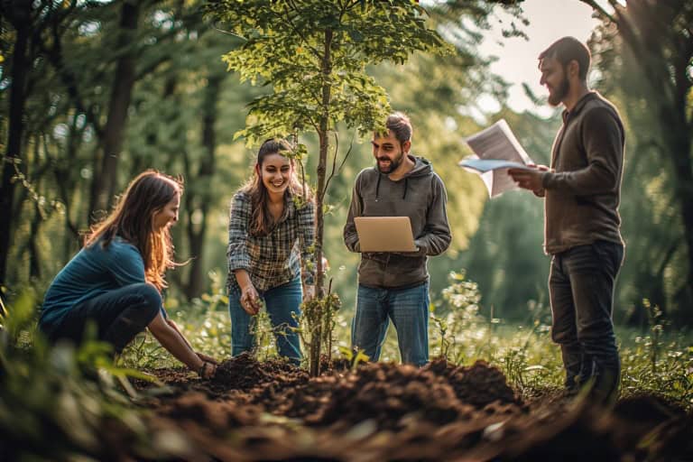 Trained workers plant trees using eco-friendly, sustainable methods.